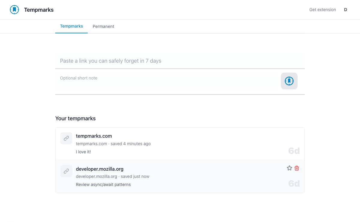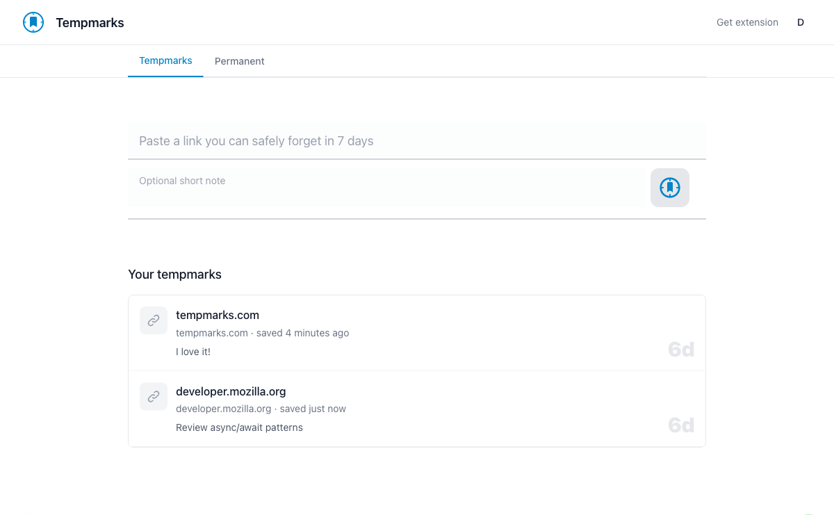 Spot something worth revisiting? Tap the Tempmarks extension and it's saved in under a second — no more "I'll just keep this tab open so I don't forget."