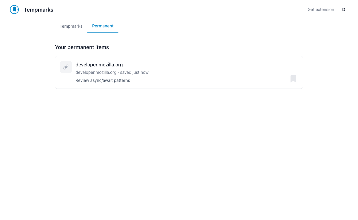 If something proves useful — a reference you revisit, a resource you rely on — you can promote it to Permanent with one click. Permanent items don't expire. They live in a separate list, so your day-to-day Tempmarks stay light.